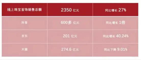目前,珠寶行業(yè)頭部企業(yè)均在線上電子商務(wù)方面持續(xù)發(fā)力,通過各大電子商務(wù)網(wǎng)站、各自注冊的抖音號、視頻號不斷更新內(nèi)容吸引消費流量。據(jù)中寶協(xié)統(tǒng)計,2022年線上珠寶首飾銷售總額約為2,350億元,同比增長27%,其中,抖音平臺珠寶品類銷售額為600多億元,同比增長1倍;京東為201億元,同比增加40.24%;天貓平臺為274.6億元,同比下降9.01%。