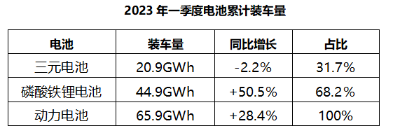 2023年一季度,我國動力電池累計裝車量為65.9GWh,同比增長28.4%。其中三元電池累計裝車量為20.9GWh,占比31.7%,同比下降2.2%;磷酸鐵鋰電池累計裝車量為44.9GWh,占比68.2%,同比增長50.5%。