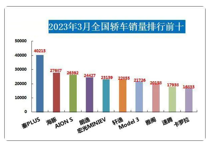 2023年3月,秦PLUS單月銷量達40215輛,宋PLUS為30088輛,分別占據轎車和SUV排行榜榜首,顛覆了長期雄霸轎車和SUV榜首的朗逸、軒逸和哈弗H6的地位,對傳統(tǒng)燃油車市場構成強力沖擊。