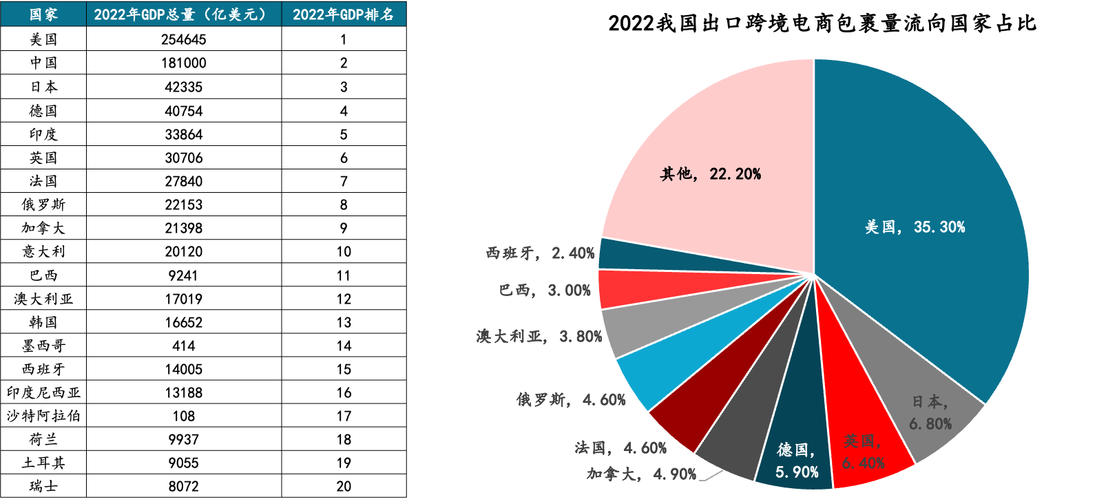 以跨境電商物流為例,根據(jù)2022年我國出口跨境電商包裹量流向國家占比,其中8個是GDP排名TOP10的國家,兩個為TOP10-15的國家。說明跨境電商物流的需求量與地區(qū)的經(jīng)濟(jì)發(fā)展高度相關(guān),所以跨境物流企業(yè)要擁抱發(fā)達(dá)經(jīng)濟(jì)體。