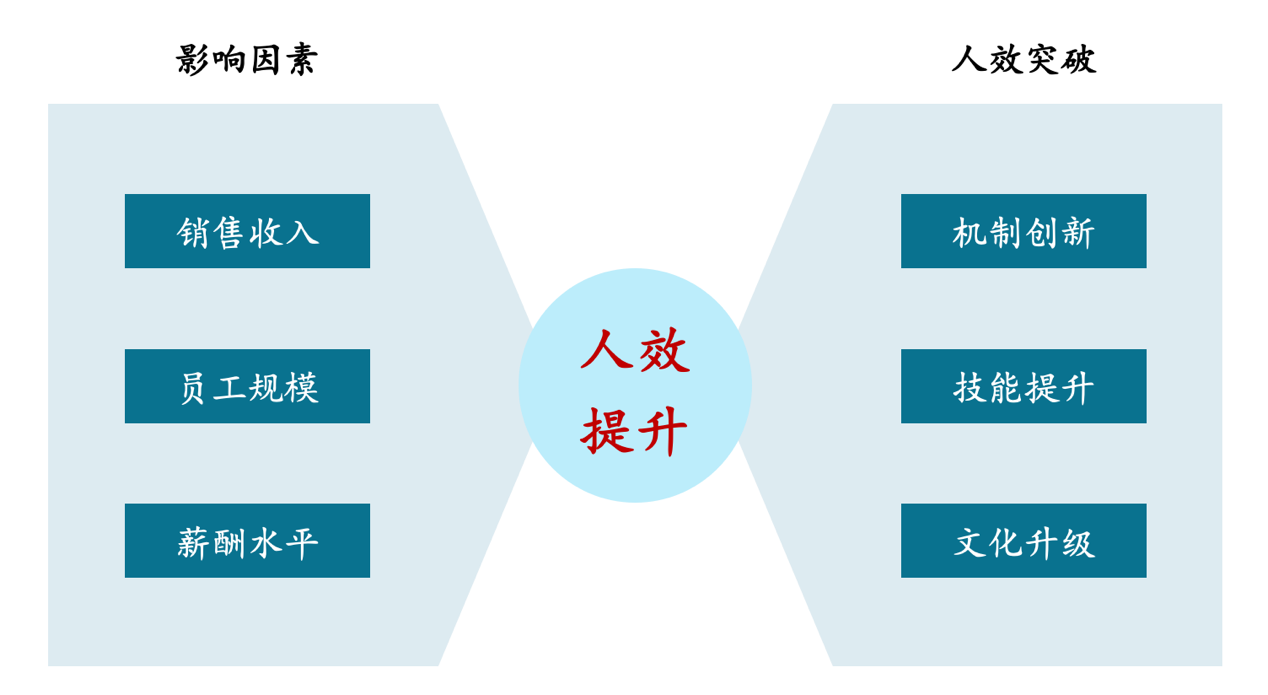 由此可以看出,企業(yè)的人均效能與總收入、總人數(shù)、平均薪酬三個關鍵要素有關。