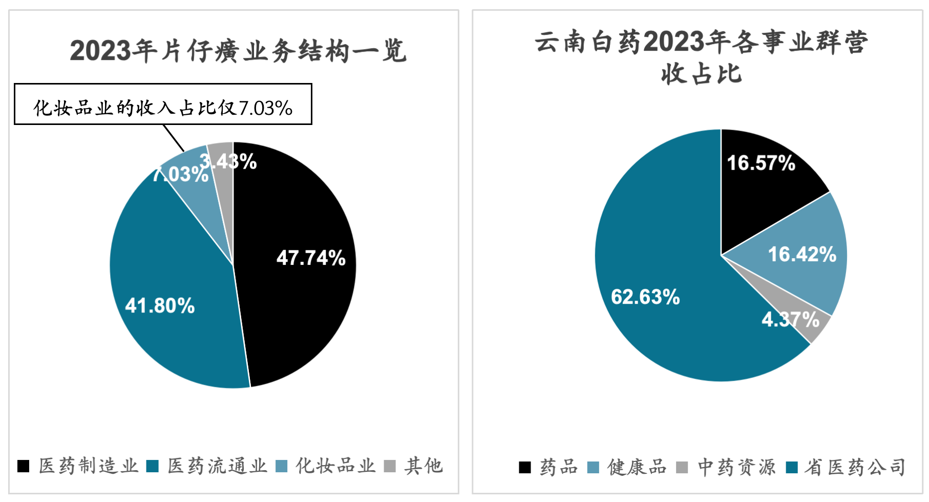 除了醫(yī)藥制造和醫(yī)藥流通板塊,各家醫(yī)藥企業(yè)也在積極地向化妝品、個(gè)護(hù)、醫(yī)美等新領(lǐng)域多元化拓展,減少對(duì)醫(yī)藥行業(yè)的依賴。例如,云南白藥向日化領(lǐng)域進(jìn)軍,并積極向骨傷科、醫(yī)美等領(lǐng)域拓展,將其打造成一個(gè)現(xiàn)代化的大健康企業(yè);片仔癀將其業(yè)務(wù)滲透至美妝賽道,化妝品業(yè)績(jī)?cè)鲩L(zhǎng)迅猛。
