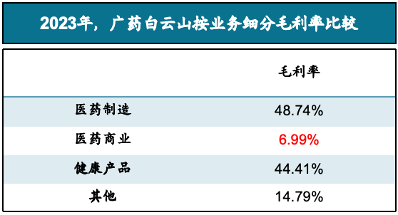 通過(guò)2023年白云山按業(yè)務(wù)細(xì)分毛利率的數(shù)據(jù)不難看出,占白云山營(yíng)收將近七成的大頭——醫(yī)藥商業(yè)板塊,毛利率僅有6.99%,這也說(shuō)明了為什么白云山的營(yíng)收規(guī)模大而凈利率很低。