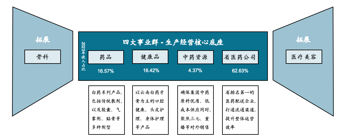 然而,云南白藥并沒(méi)有止步于此,在2010年又提出了“新白藥,大健康”的新戰(zhàn)略,目標(biāo)由傳統(tǒng)制藥企業(yè)向現(xiàn)代化大健康企業(yè)轉(zhuǎn)型,以藥品、健康品、中藥資源和省醫(yī)藥公司為四大核心事業(yè)群,骨科和醫(yī)美為兩大拓展業(yè)務(wù),進(jìn)一步擴(kuò)大其多元化發(fā)展的范圍,實(shí)現(xiàn)公司形象和產(chǎn)品形象從傷科護(hù)理向?yàn)橄M(fèi)者創(chuàng)造現(xiàn)代健康新生活方式轉(zhuǎn)變。