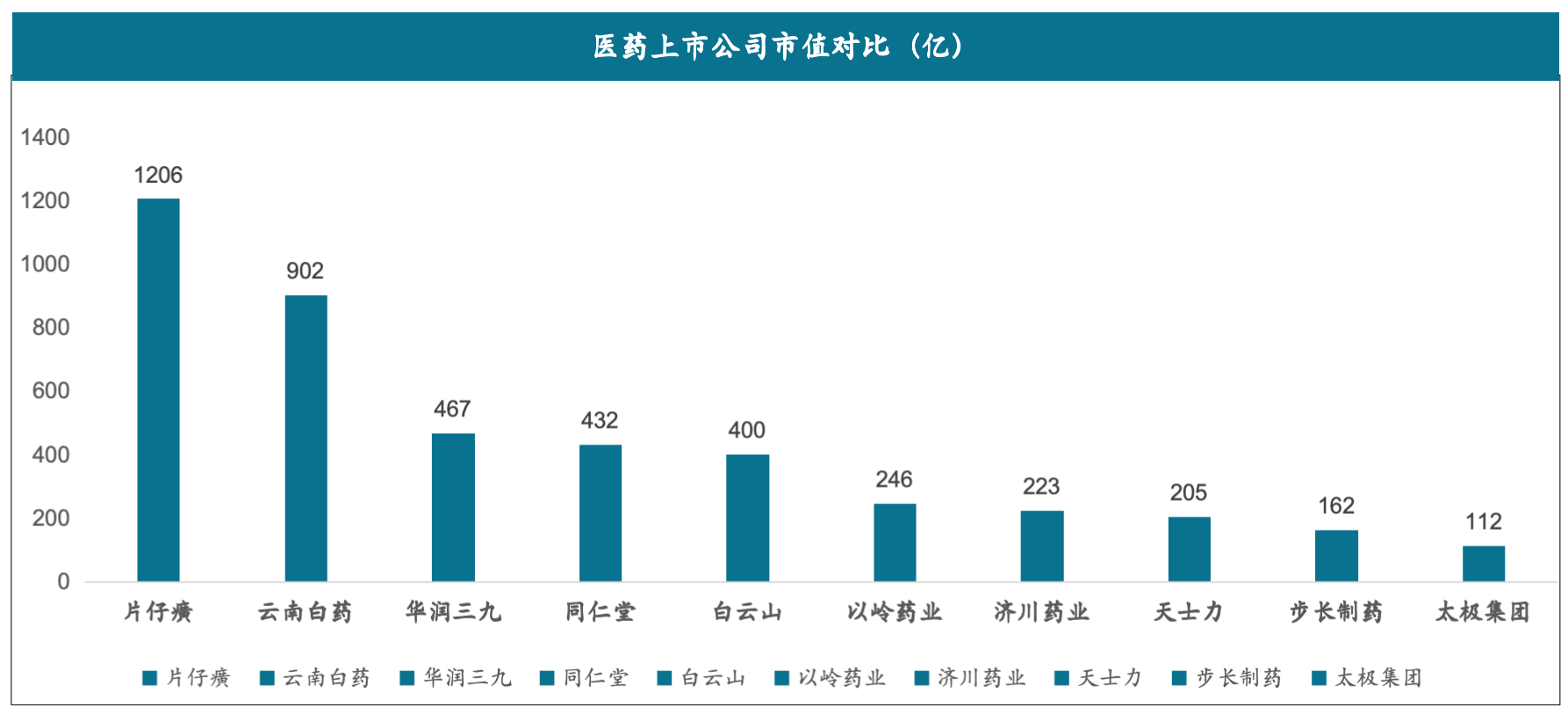 再看這十家公司的市值,營(yíng)收排名第八的片仔癀居然位居榜首,市值突破千億,這是為什么呢?