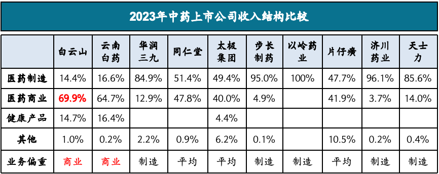 從下圖各醫(yī)藥上市公司的業(yè)務(wù)結(jié)構(gòu)中可以看出,白云山和云南白藥兩家公司是以醫(yī)藥商業(yè)為主,而華潤(rùn)三九、步長(zhǎng)制藥、以嶺藥業(yè)、濟(jì)川藥業(yè)和天士力以醫(yī)藥制造業(yè)為主,剩下的同仁堂、太極集團(tuán)、片仔癀三家公司這兩個(gè)業(yè)務(wù)的占比差不多。