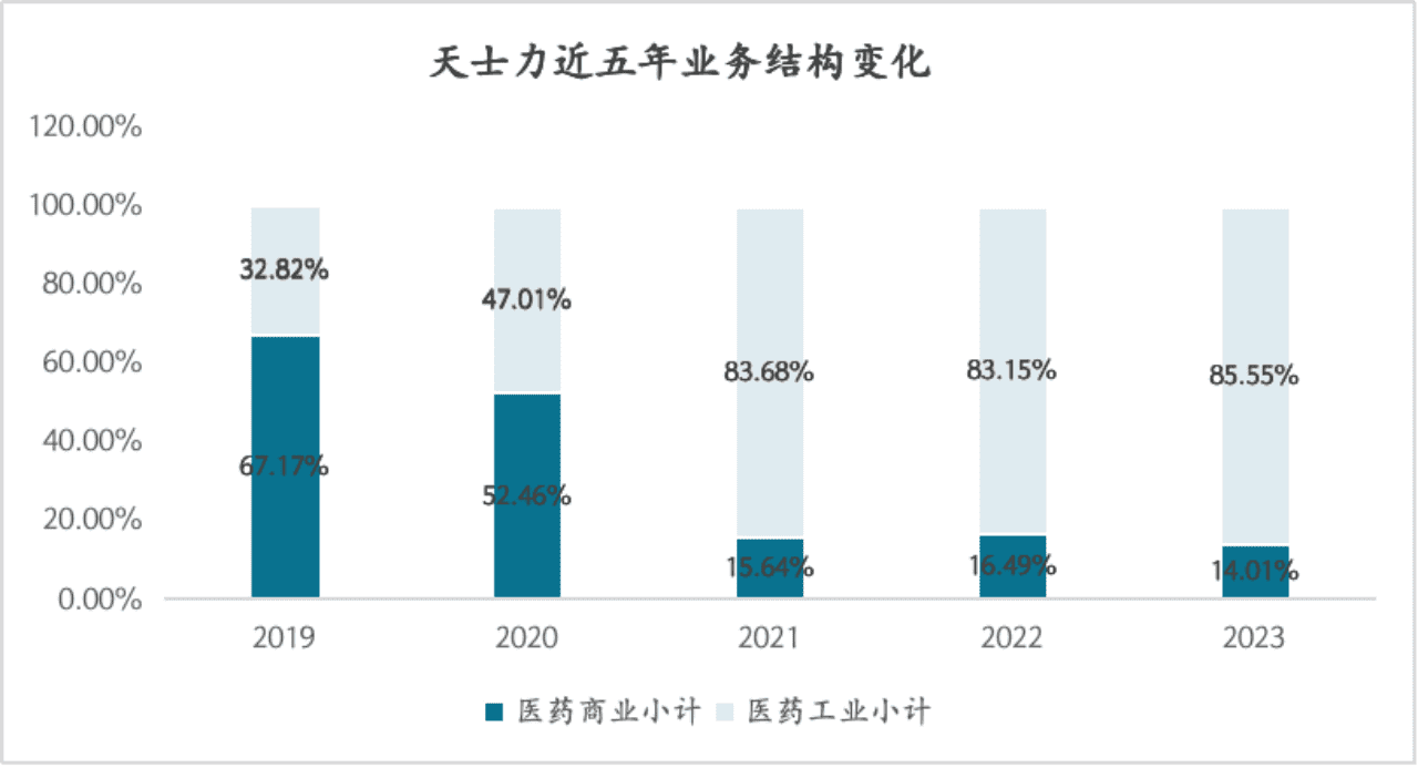 2020年8月,天士力做了一個(gè)大膽的決定,將其子公司天士營(yíng)銷99.94%股權(quán)作價(jià)14.89億元出售給重藥控股子公司重慶醫(yī)藥。僅僅兩年的時(shí)間,天士力的醫(yī)藥商業(yè)收入規(guī)模從原來(lái)的127億縮減到了12億,整體營(yíng)收規(guī)模減少了超過(guò)一百億。這一重大的戰(zhàn)略變化使得天士力實(shí)現(xiàn)業(yè)務(wù)結(jié)構(gòu)的轉(zhuǎn)型,將主業(yè)聚焦在醫(yī)藥制造上。