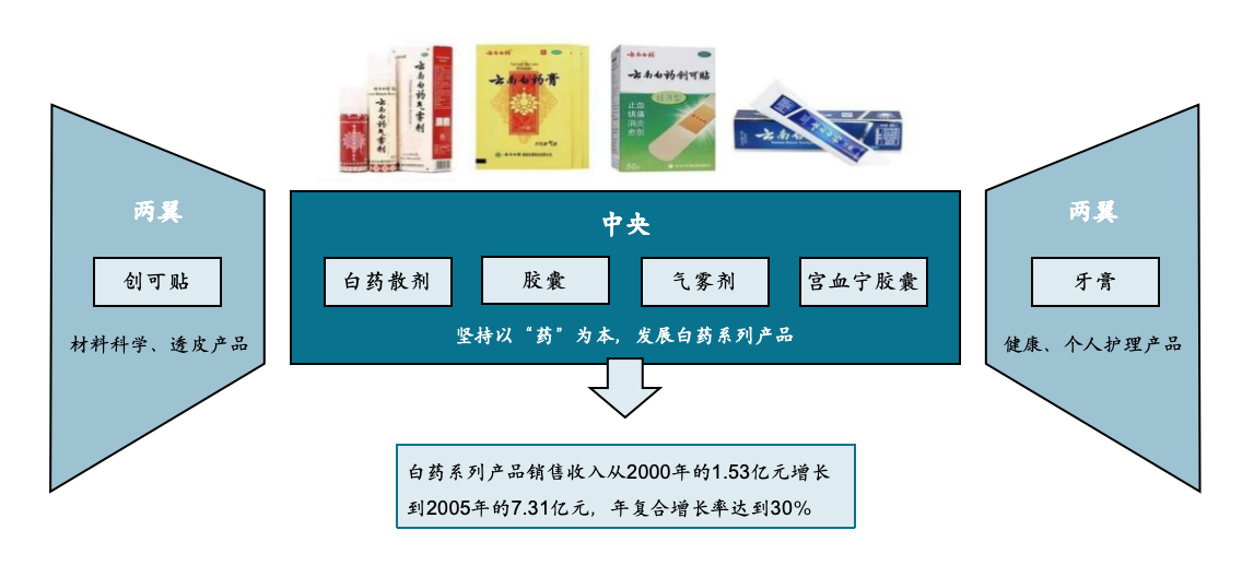 從成立至今,云南白藥精準(zhǔn)圍繞“活血止痛,消腫散瘀”進(jìn)行了多次創(chuàng)新。針對(duì)產(chǎn)品結(jié)構(gòu)單一、產(chǎn)品形態(tài)日趨老化的狀態(tài),云南白藥在2005年提出“穩(wěn)中央,突兩翼”,從傳統(tǒng)白藥向透皮、個(gè)人護(hù)理類藥品拓展。代表性的產(chǎn)品為云南白藥創(chuàng)可貼和云南白藥牙膏,截止2023年,云南白藥創(chuàng)可貼零售市場(chǎng)份額66.5%,排名市場(chǎng)排名第一;云南白藥牙膏市場(chǎng)份額24.60%,且首次單店銷售業(yè)績(jī)突破億,穩(wěn)坐市場(chǎng)份額第一寶座。