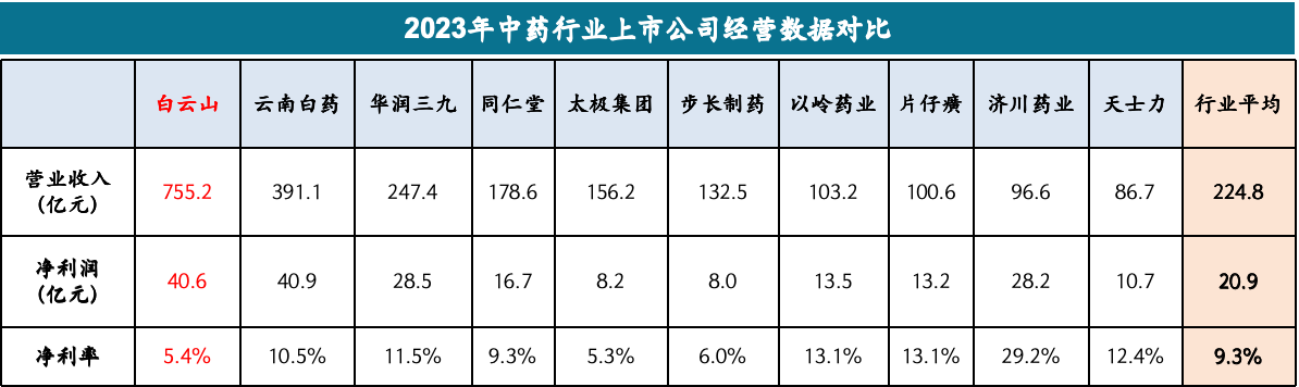 從收入規(guī)模來(lái)看,白云山穩(wěn)坐中藥行業(yè)的老大位置,其2023年?duì)I業(yè)收入達(dá)到755億,是同類醫(yī)藥公司的數(shù)倍。然而,從凈利率上來(lái)看,白云山幾乎在十家醫(yī)藥企業(yè)中墊底,遠(yuǎn)低于行業(yè)平均水平,這是為什么呢?