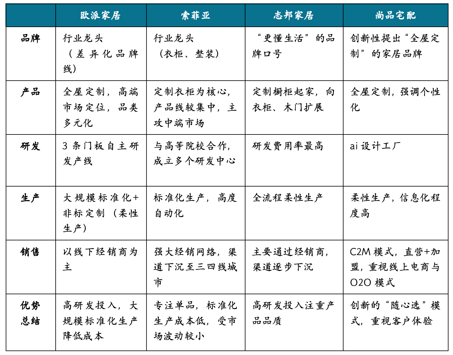 從總營收和凈利率來看,歐派家居都一騎絕塵,是當(dāng)之無愧的龍頭企業(yè)。從銷售費(fèi)用率上看,尚品宅配的銷售費(fèi)用占比最高,主要是因?yàn)樵谥睜I模式投入較多,花費(fèi)大量的人力物力進(jìn)行銷售和管理,同時(shí)也反映出其對(duì)銷售費(fèi)用的管控能力較弱,還未形成歐派家居那樣的規(guī)模效應(yīng)。從研發(fā)費(fèi)用率來看,志邦家居和歐派家居是相對(duì)更加注重研發(fā)的企業(yè),持續(xù)專注于新材料、新產(chǎn)品的研發(fā)創(chuàng)新,緊跟消費(fèi)者需求的變化,向“大家居定制”逐步轉(zhuǎn)型,提出全屋定制的多樣化服務(wù)方案。具體的CR4成長戰(zhàn)略對(duì)比分析如下:
